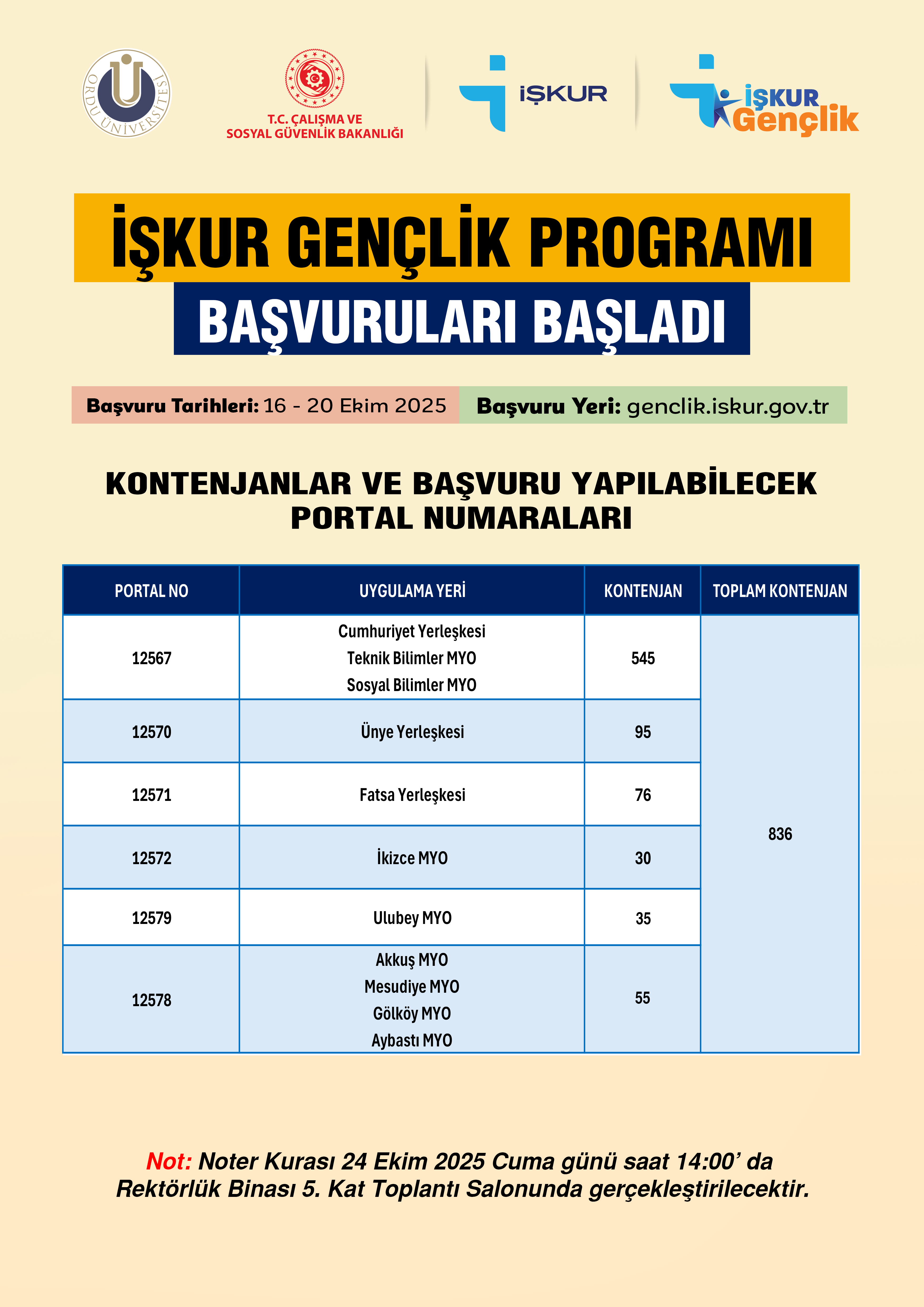 Not: Noter kurası 24 Ekim 2025 Cuma günü saat 14.00 da Rektörlük Binası 5. Kat Toplantı Salonunda yapılacak olup, dileyen öğrencilerimiz kura çekimini izleyebilir. Noter Kurası çekim İşlemlerinin tamamlanmasından sonra istenilecek belgeler üniversitemiz web sayfasından ayrıca duyurulacaktır.